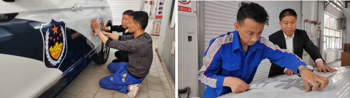 5为:售后漆工冶龙正在为警车贴警徽标志,他说:“警车是公务用车,每次粘警饰我都感到很神圣,干活儿特别用心细致,一定要把车身警饰做得非常好才行。警徽闪耀,守望千家万户。我是漆工也是工匠,必须精益求精,把活儿干漂亮,这也是汽贸漆工的脸面。每次我都把车清洗干净,用卷尺量好间距,用记号笔画好。在贴的过程中用刮板反复挤压空气,这样才能使警徽粘得更牢固更美观。我要把公司倡导的劳动精神、工匠精神,通过不断地学习锻炼,提高本领,把精湛的工匠手艺和贴心的服务传递给社会。