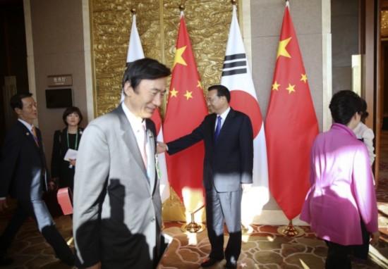 李克强总理会见韩国总统朴槿惠时对方提出,韩方愿同中方等各方加强沟通协调,争取新一轮韩中日领导人会议早日举行。李克强说:"希望在重大问题上,日方能与中方、韩方相向而行。"
