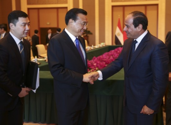 李克强总理会见埃及总统塞西,就对方希望"加强反恐合作"提议表示:"我们既要加强反恐合作,也要妥善解决热点问题,更要高度重视发展经济,以铲除恐怖主义传播的土壤。"