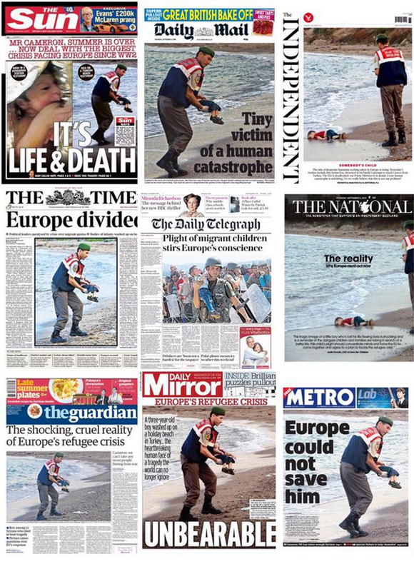 这些照片很快以标签#KiyiyaVuranInsanlik(冲上岸的人) 席卷Twitter,占据了欧洲各大报刊头版。