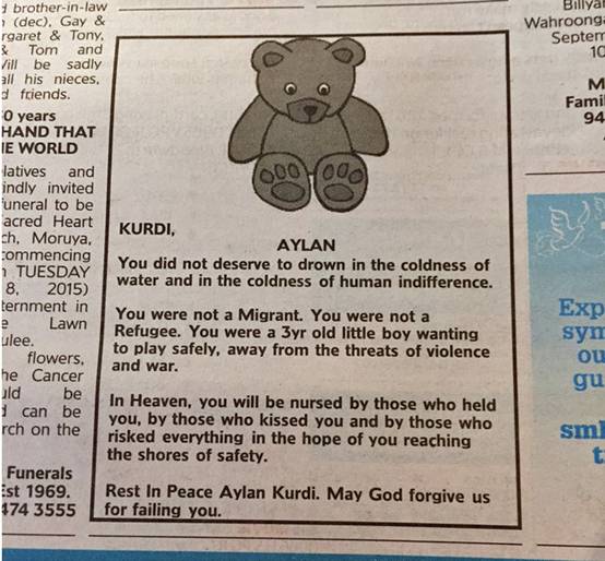 在澳大利亚,还有人在9月4日的《悉尼先驱晨报》上为小Aylan发了份讣告。
