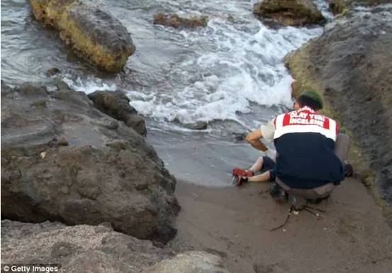 9月2日,3岁男童遗体被冲上土耳其海岸的照片让整个欧洲心碎。照片中的男孩身穿红色T恤和短裤,面部朝下趴在沙滩上。