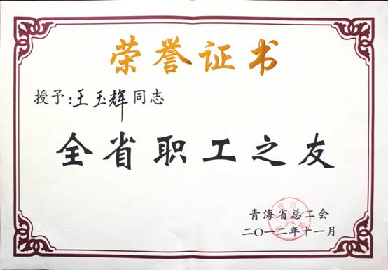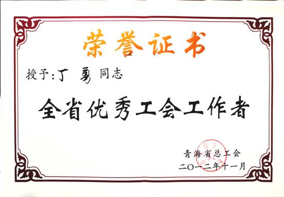 在2012年11月23日召开的青海省工会第13次代表大会上,省总工会对全省优秀个人、模范集体进行了表彰。集团总经理王玉辉同志荣获"全省职工之友"荣誉称号;青海物产物资配送有限责任公司工会荣获"全省模范职工之家"荣誉称号;马军同志荣获"全省优秀工会积极分子"荣誉称号;丁勇同志荣获"全省优秀工会工作者"荣誉称号。