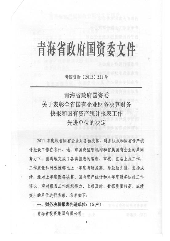 2012年,在集团及所属各公司领导的高度重视下,在所属各公司的大力支持和密切配合下,在辛勤工作在财务会计岗位上的同事们的共同努力下,集团总公司圆满完成了省国资委和省财政厅各类报表的上报工作,财务信息工作质量、时效性和财务分析水平都比上一年度有所提高,受到了省国资委和省财政厅的好评,集团总公司2011年度财务决算工作被省国资委评为先进单位,集团财务审计部张莉青同志被省财政厅评为2012年度财务快报工作先进个人。